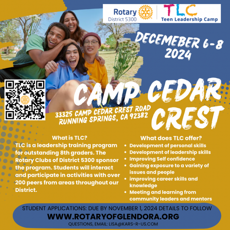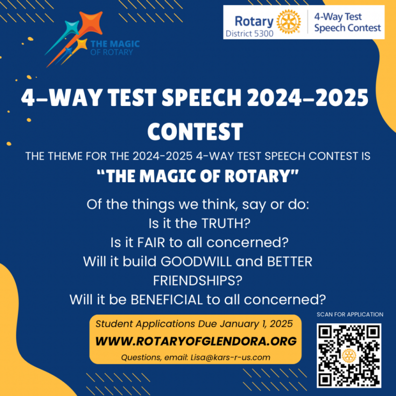 Welcome to the Rotary Club of Glendora! We’re a vibrant group of local professionals and community leaders dedicated to making a positive impact right here in Glendora and beyond. Whether you're passionate about community service, networking, or simply want to give back, we invite you to check us out and see how you can get involved. Explore our upcoming events, learn about our projects, and discover how Rotary’s commitment to "Service Above Self" can be a rewarding experience for you. Join us and help make a difference in our community!